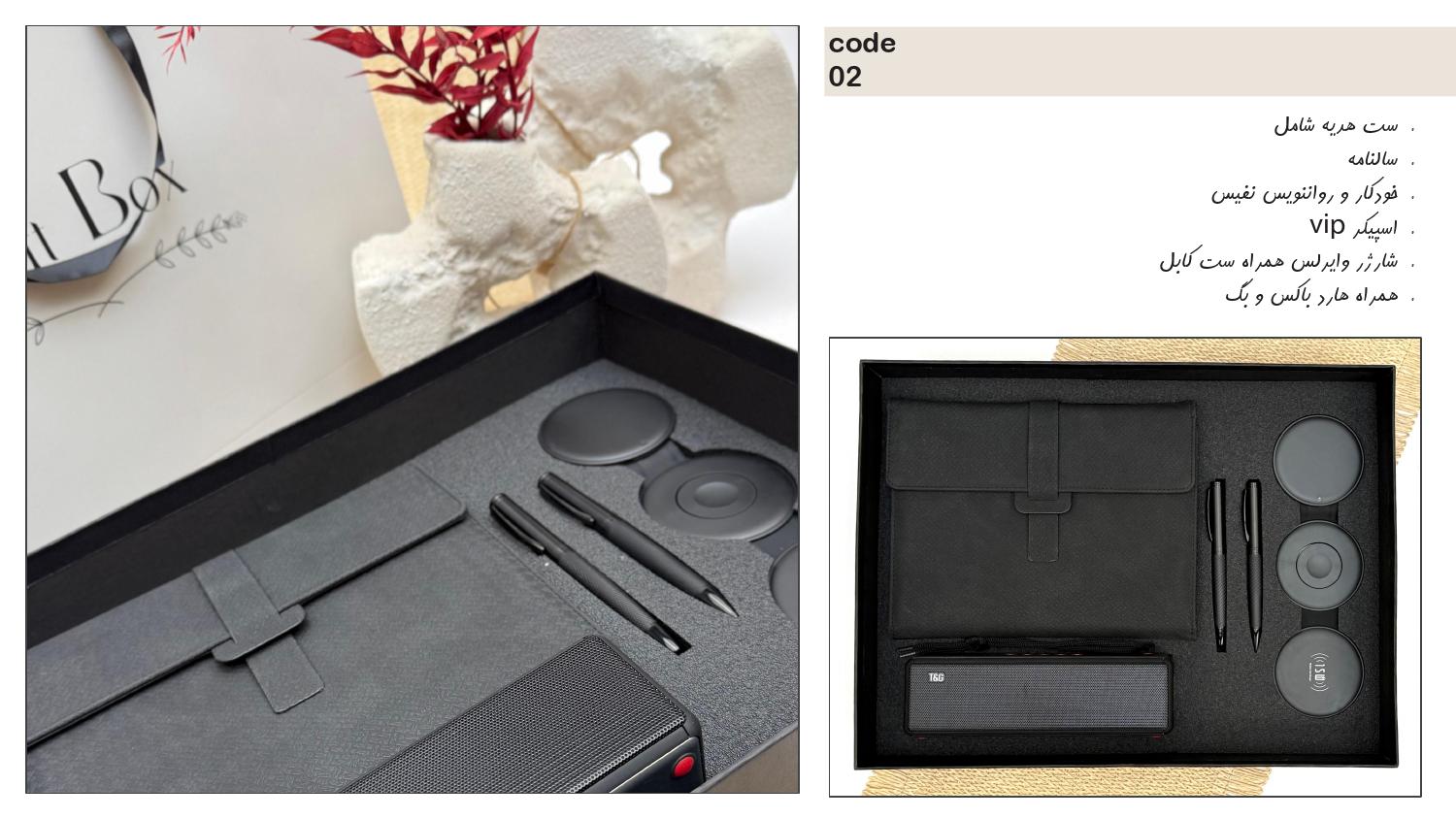 دارای سالنامه، رواننویس نفیس، اسپیکر VIP، شارژ وایرلس همراه ست کابل، همراه هارد باکس و بگ