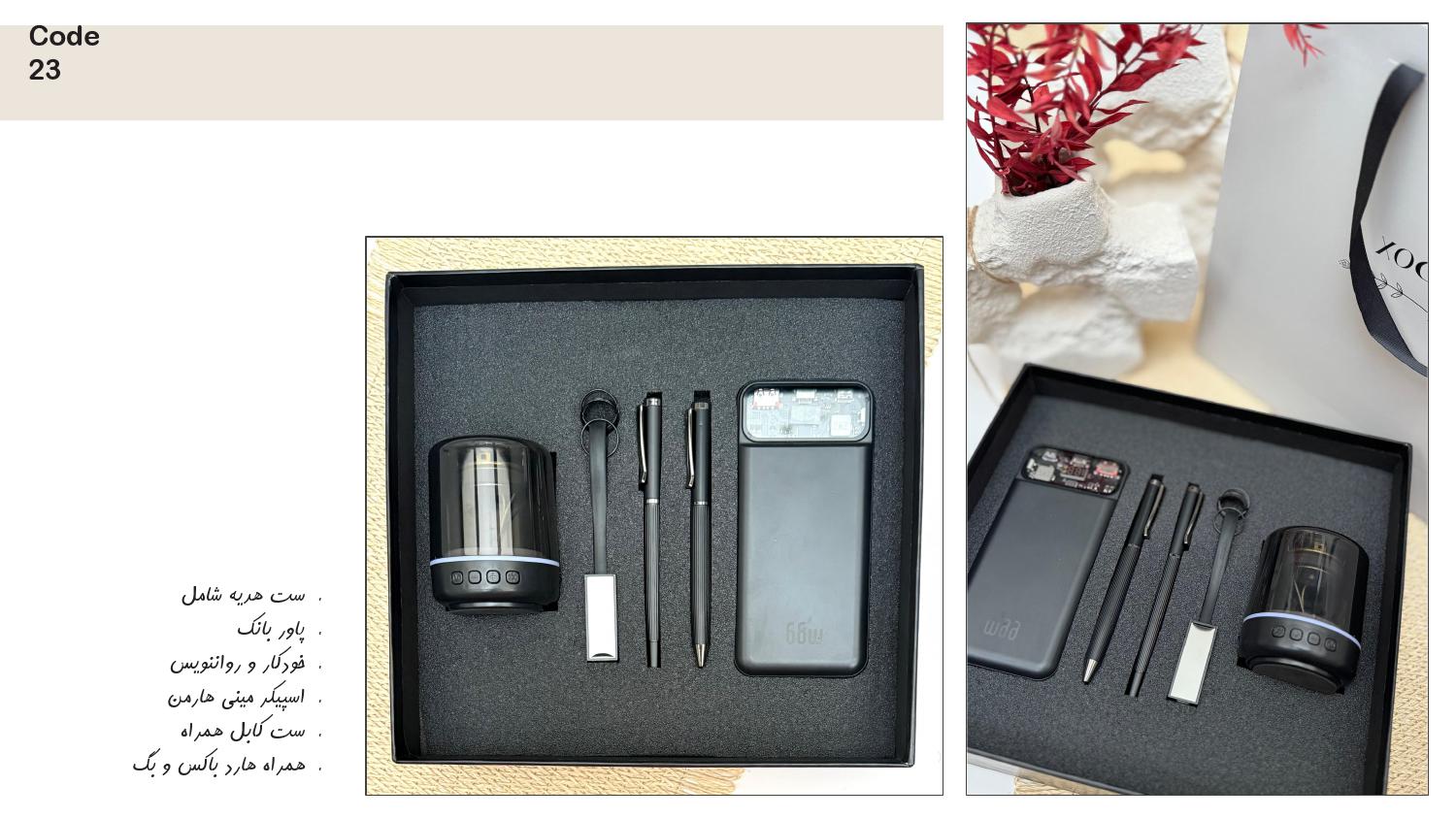 پاوربانک، خودکار و رواننویس، اسپیکر مینی هارمن، ست کابل همراه، همراه هارد باکس و بگ