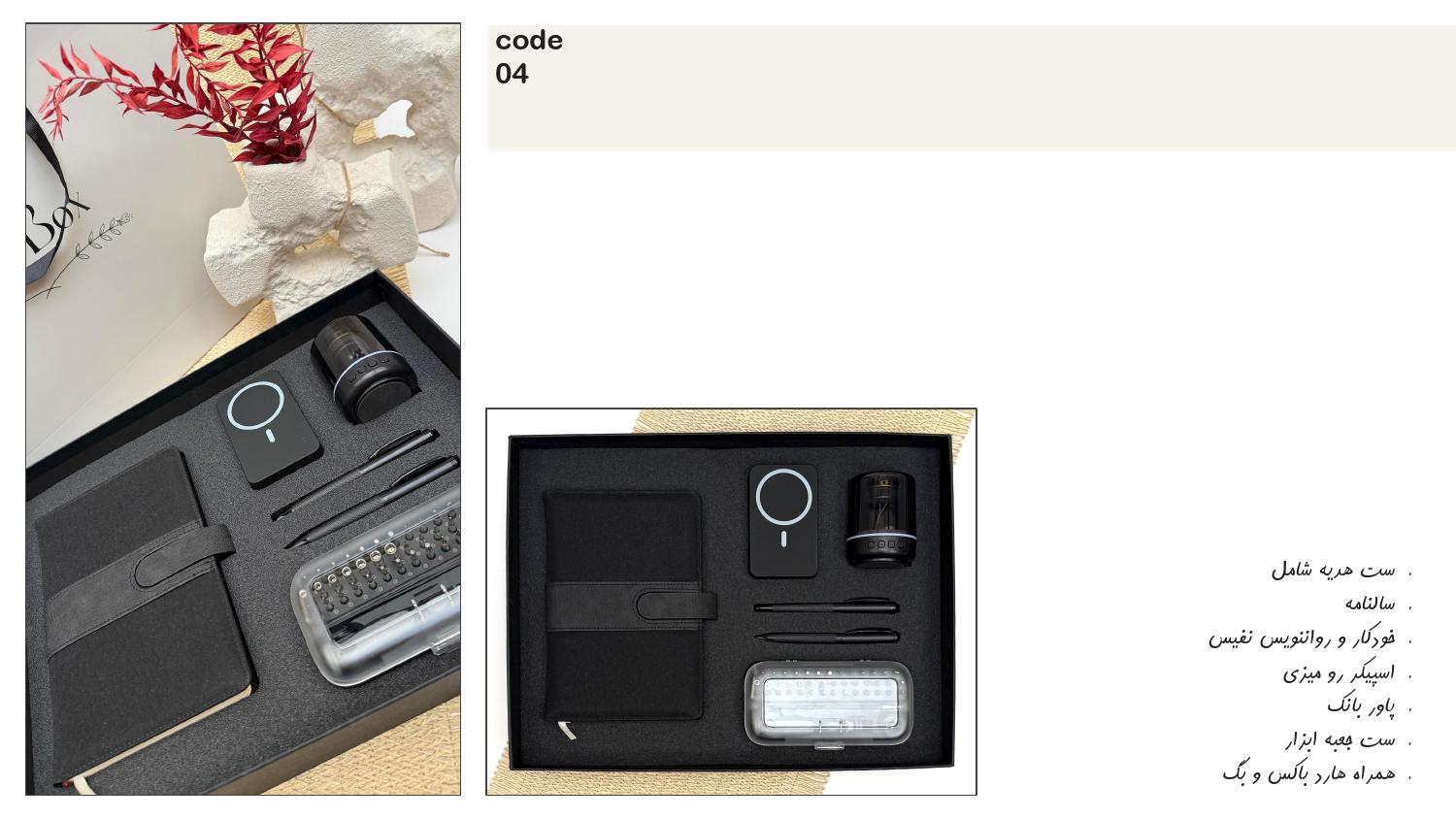 دارای سالنامه، خودکار و رواننویس نفیس، اسپیکر رومیزی ، پاوربانک، ست ابزار، همراه هارد باکس و بگ
