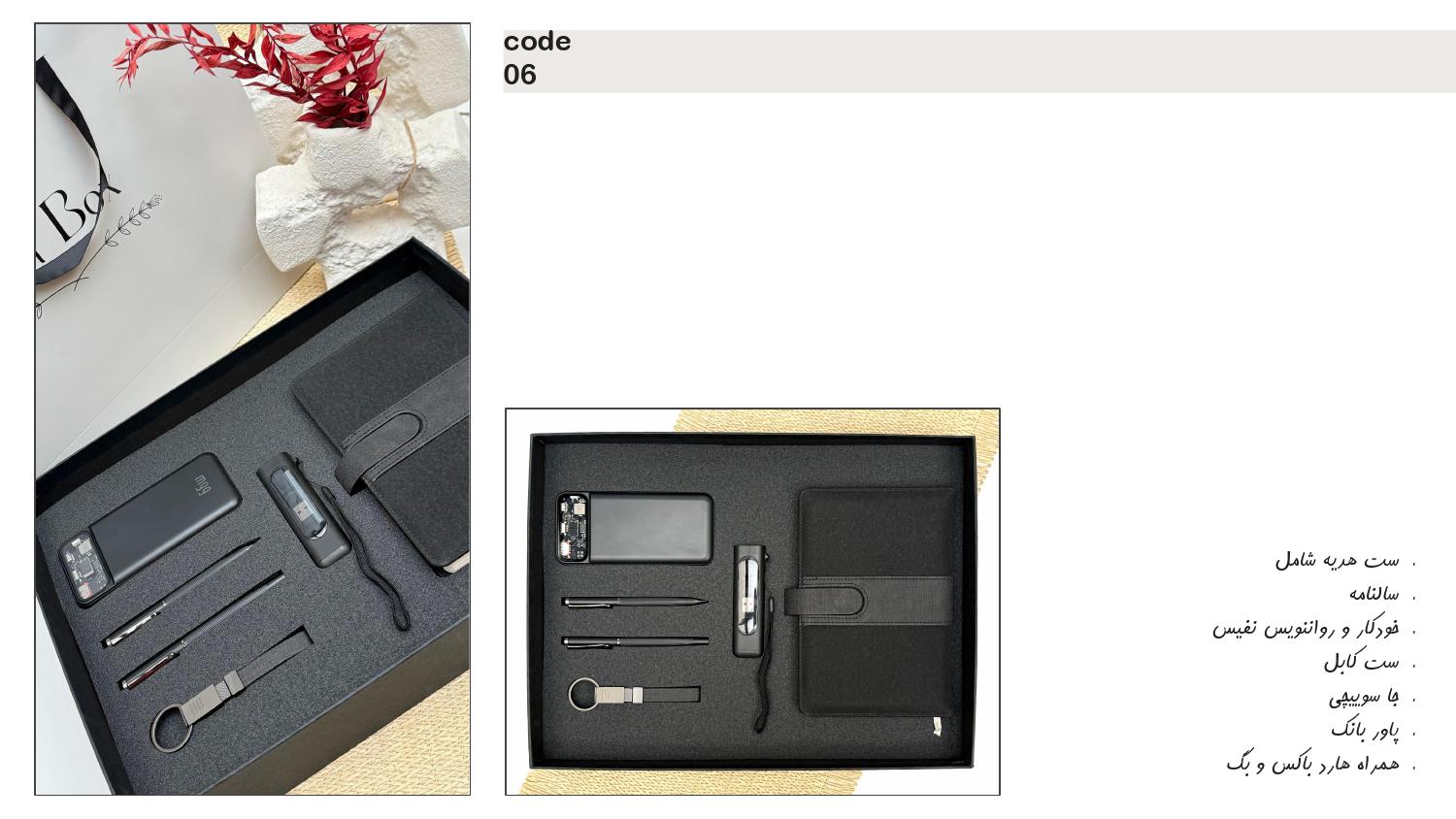 دارای سالنامه، خودکار و رواننویس نفیس، ست کابل، پاوربانک، جاسوئیچی، پاوربانک، همراه هارد باکس و بگ